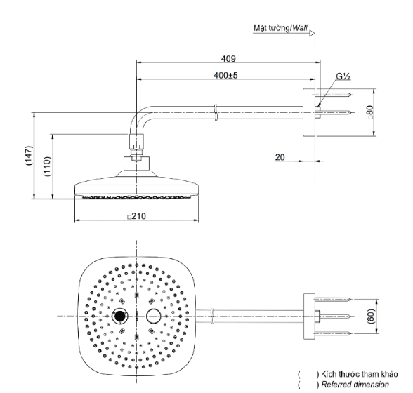 Bản vẽ Bát Sen Gắn Tường TOTO TBW02004A Vuông 210mm 2 Chế Độ