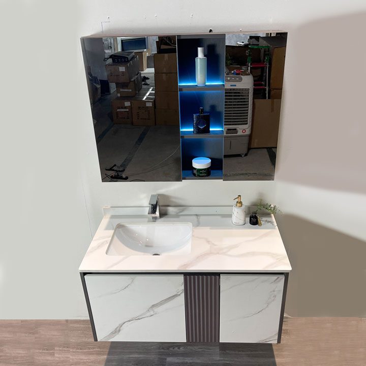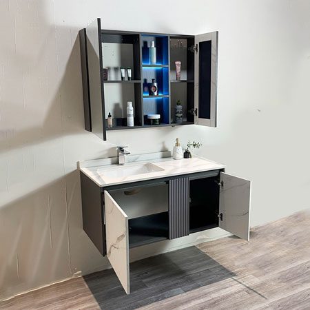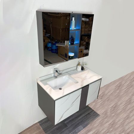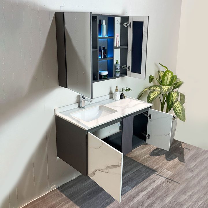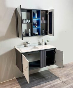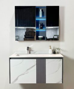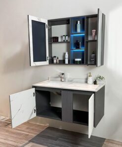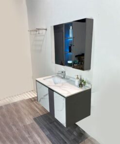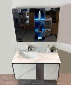• Chất liệu: Tủ chậu Plywood E1 nhiệt đới hóa, mặt bàn đá nhân tạo, gương LED Phôi Bỉ