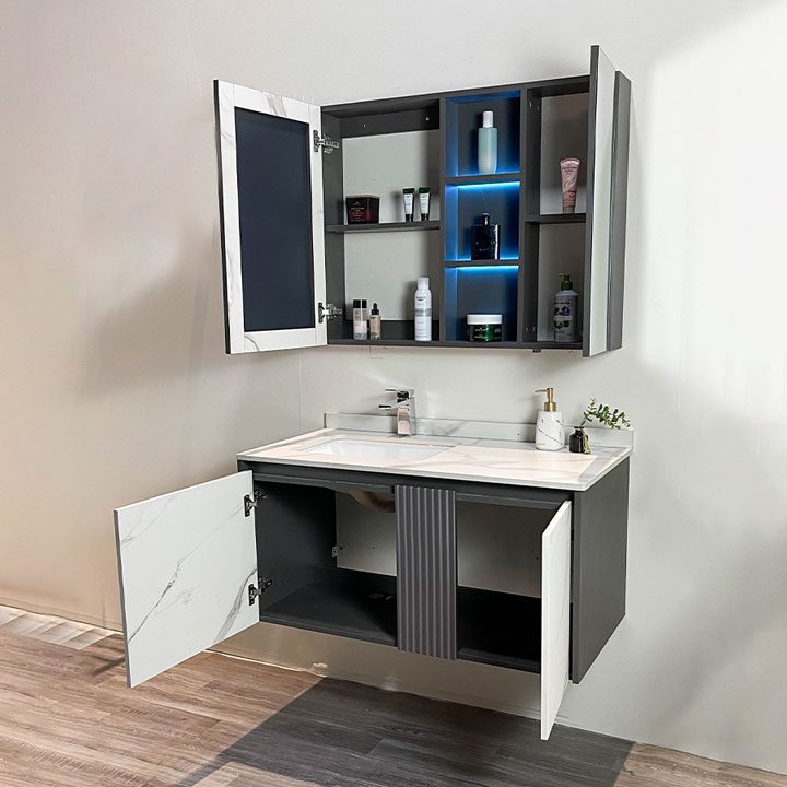 • Bộ sản phẩm bao gồm: Tủ chậu, gương LED, chậu lavabo âm bàn đá