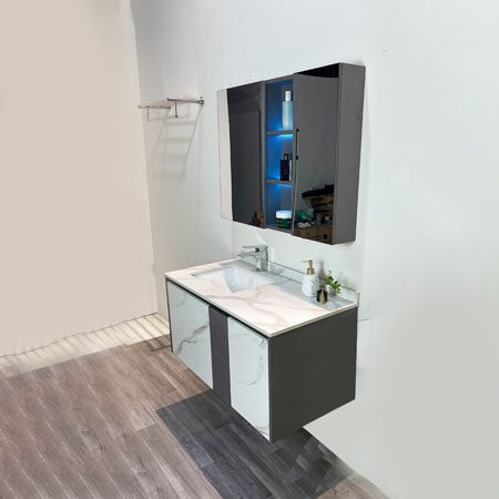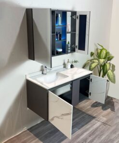 • Thiết kế sang trọng: Kiểu dáng hiện đại, kết hợp hài hòa giữa tủ chậu, gương LED và chậu lavabo âm bàn đá tạo nên điểm nhấn ấn tượng cho phòng tắm.