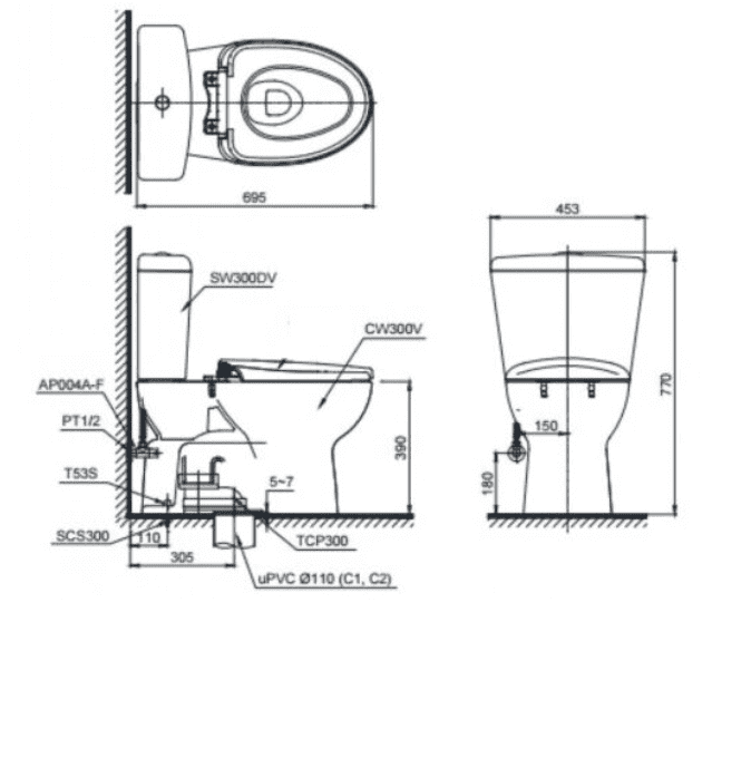 Bản vẽ Bồn Cầu Điện Tử TOTO CS300DRW16#W Kèm Nắp Rửa Điện Tử WASHLET Dòng C2