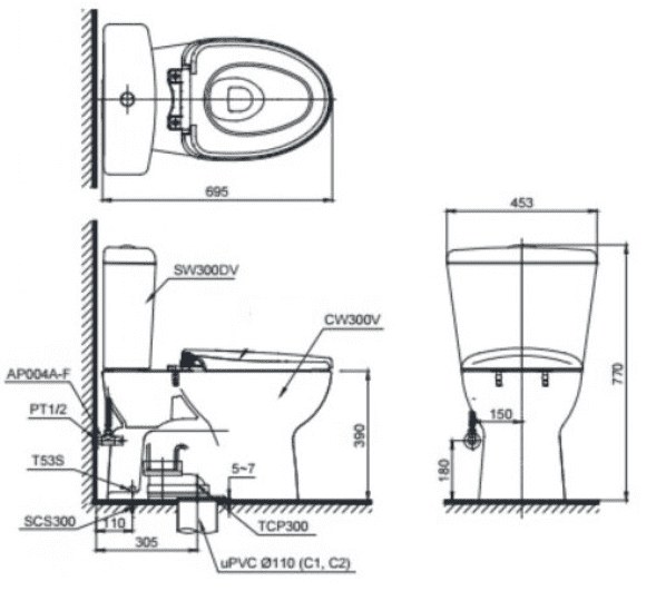 Bản vẽ Bồn Cầu Điện Tử TOTO CS300DRW7#W Kèm Nắp Rửa Điện Tử WASHLET Dòng C2 – TCF6631A (220V)