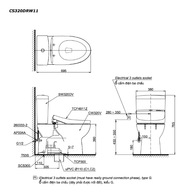 Bản vẽ Bồn Cầu Điện Tử TOTO CS320DRW11#W Kèm Nắp Rửa Điện Tử WASHLET Dòng S7 – TCF4911Z Kiểu Bồn cầu thoát ngang