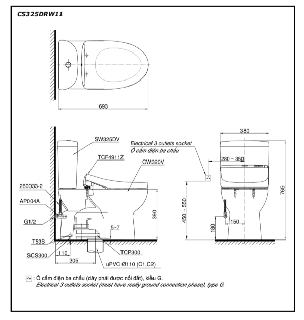 Bản vẽ Bồn Cầu Điện Tử TOTO CS325DRW16#W Kèm Nắp Rửa Điện Tử WASHLET Dòng C2 – TCF23410AAA (220V)