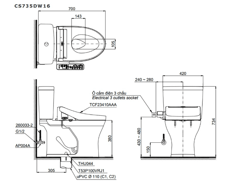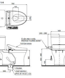Bản vẽ Bồn Cầu Điện Tử TOTO CS735DW16#XW Kèm Nắp Rửa Điện Tử WASHLET Dòng C2 – TCF23410AAA
