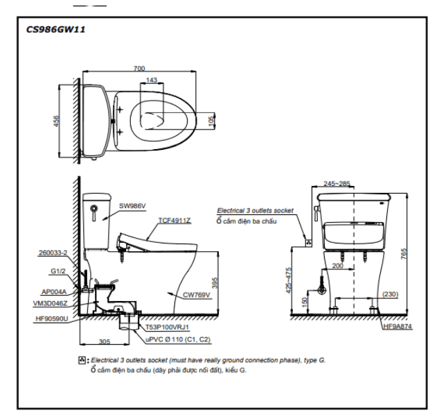 Bản vẽ Bồn Cầu Điện Tử TOTO CS986GW14#XW Kèm Nắp Rửa Điện Tử WASHLET Dòng C5 – TCF24410AAA (220V)