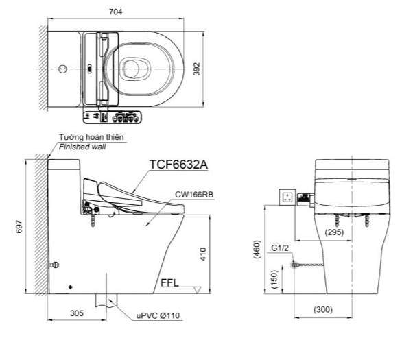 Bản vẽ Bồn Cầu Điện Tử TOTO CW166RB#XW