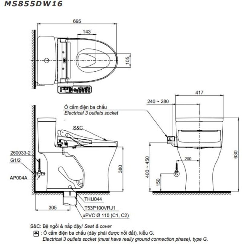 Thông số kỹ thuật của bồn cầu tự rửa thông minh TOTO MS855DW16