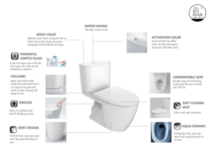 • Công nghệ xả Powerful Vortex, với hai cửa xả (một cửa xả, một cửa đẩy trợ lực) tạo dòng nước xoáy mạnh mẽ, xả sạch mọi chất bẩn