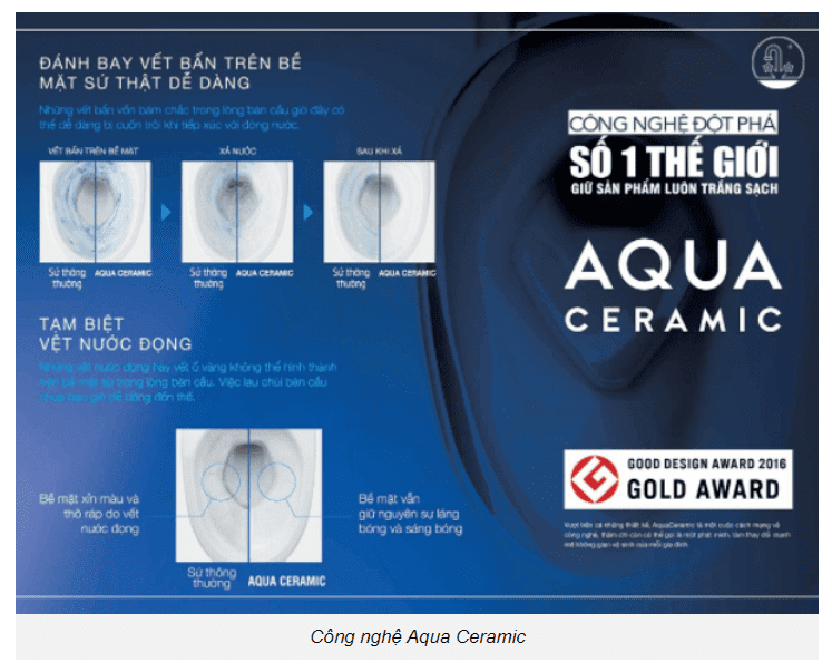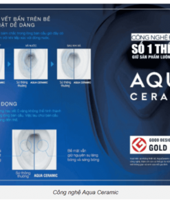 • Công nghệ Aqua Ceramic chống bám bẩn: Hạn chế tối đa sự hình thành vệt ố vàng trên bề mặt sứ, giúp sản phẩm luôn sáng bóng. Lớp màng phủ đặc biệt có khả năng làm tăng sức căng bề mặt nước, ngăn chặn các giọt nước đọng lại, giúp hạt cặn Silic không thể bám vào bề mặt men sứ, từ đó giảm tần suất vệ sinh và hạn chế sử dụng hóa chất tẩy rửa.