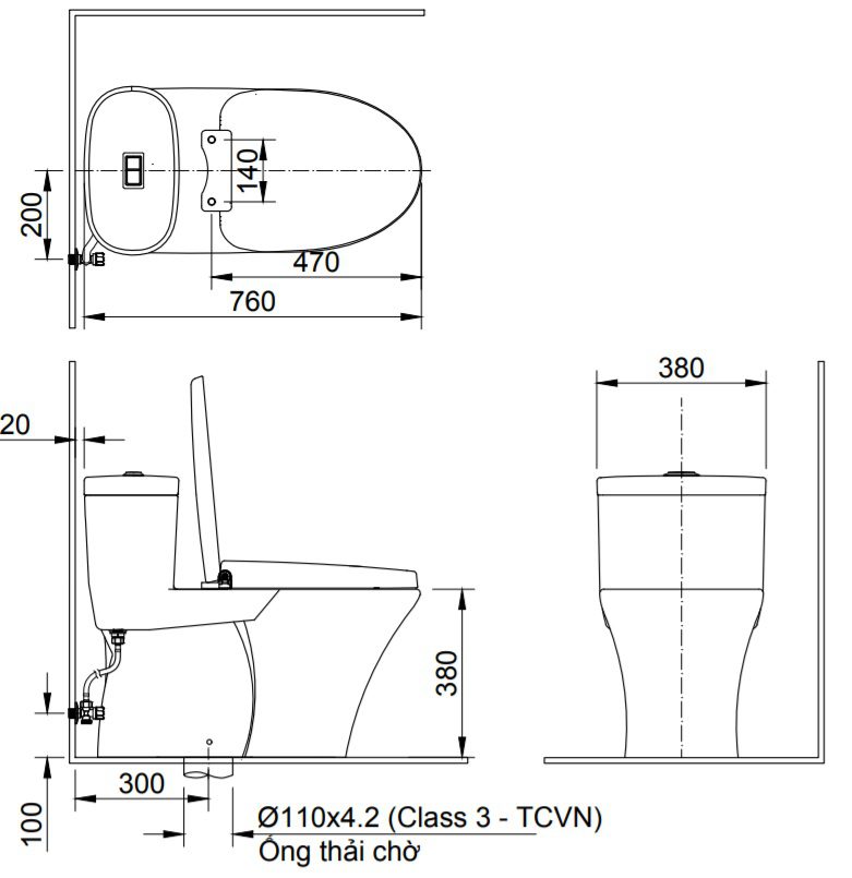 Kích thước bồn cầu (DxRxC) 760x380x636 mm