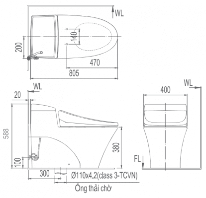 - Kích thước bồn cầu: 805x400x558 mm (DxRxC)
