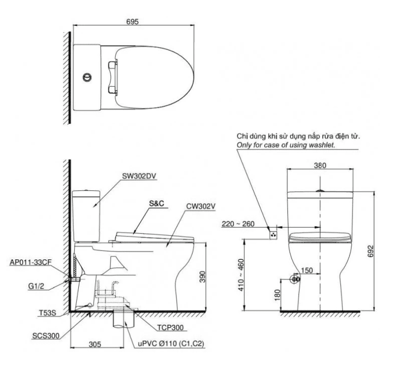 Bản vẽ Bồn cầu TOTO CS302DT3#W
