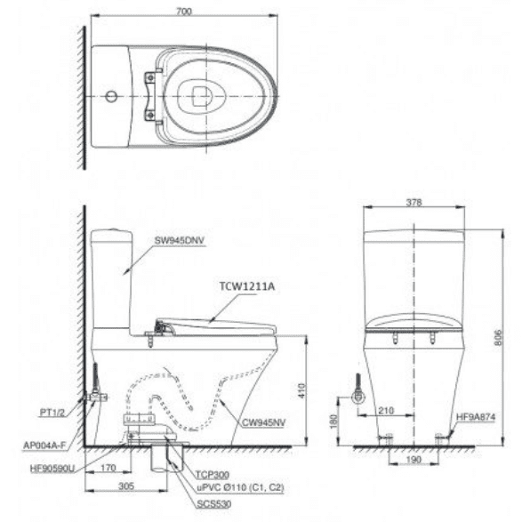 • Dưới đây là bản vẽ kỹ thuật của loại bệt cầu ToTo này giúp bạn dễ dàng lắp đặt ngay tại nhà