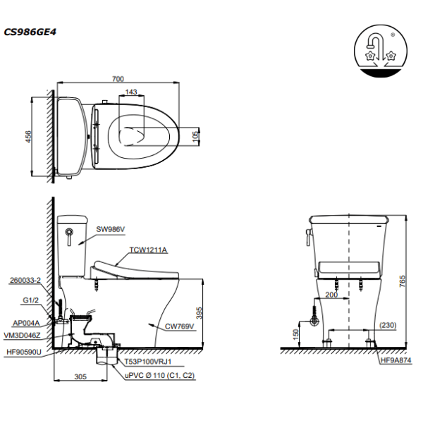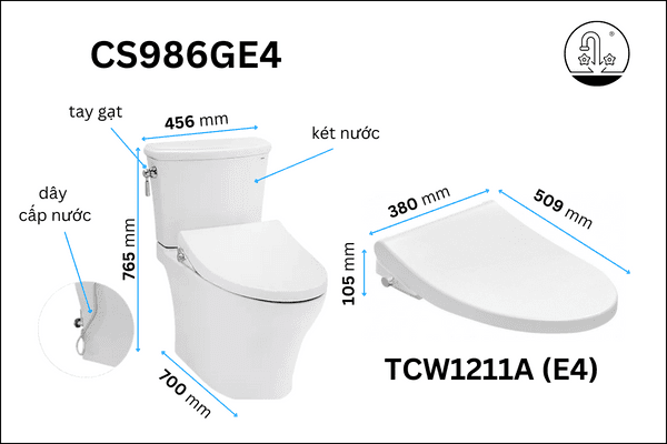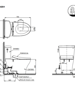 Thông số kĩ thuật Bồn Cầu TOTO CS986GE4#XW 2 Khối Nắp Rửa Cơ TCW1211A