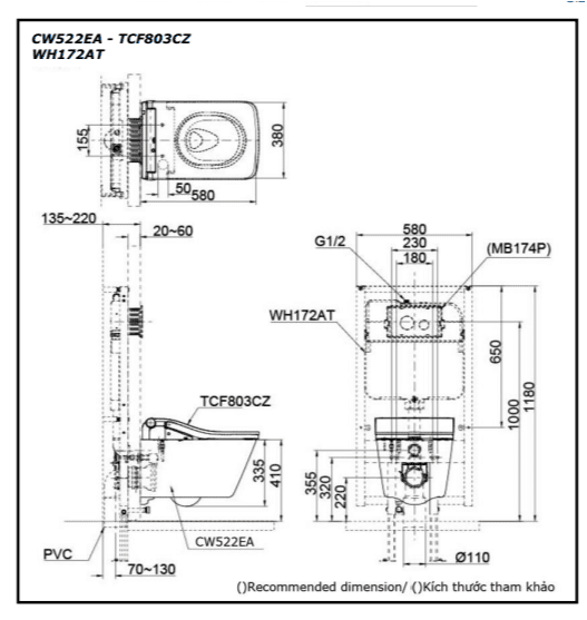 Bản vẽ Bồn Cầu TOTO CW522EA#NW1/TCF803CZ#NW1/WH172AT Treo Tường