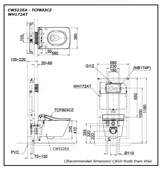 Bản vẽ Bồn Cầu TOTO CW522EA#NW1/TCF804C2Z#NW1/WH172AAT Treo Tường
