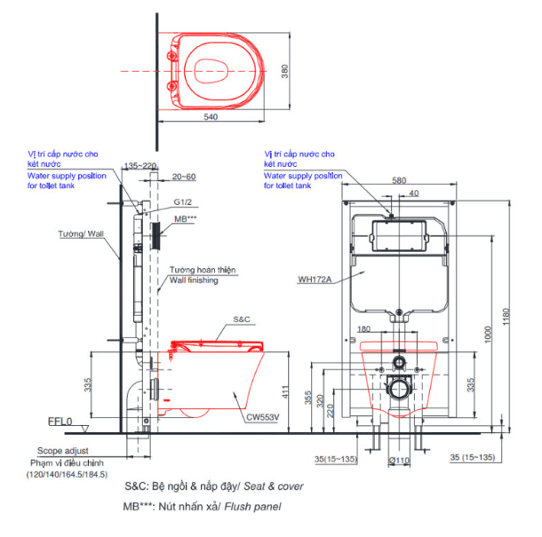 Thông số cơ bản của Bồn Cầu TOTO CW553#XW/TCF33320GAA#NW1/WH172A Treo Tường
