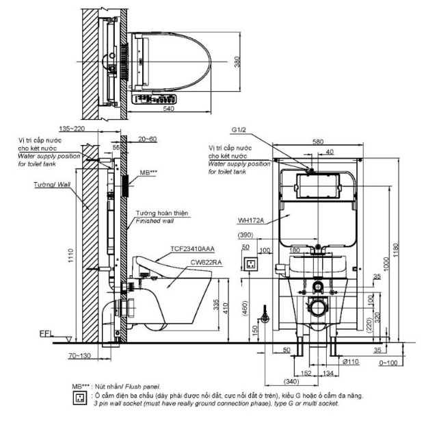 Bản vẽ Bồn Cầu TOTO CW822RA#W/TC385VS#W Treo Tường