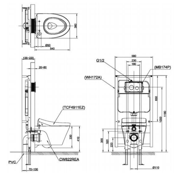 Bản vẽ Bồn Cầu TOTO CW822REA#W/TCF4911EZ#NW1/WH172AAT/TCA464 Treo Tường