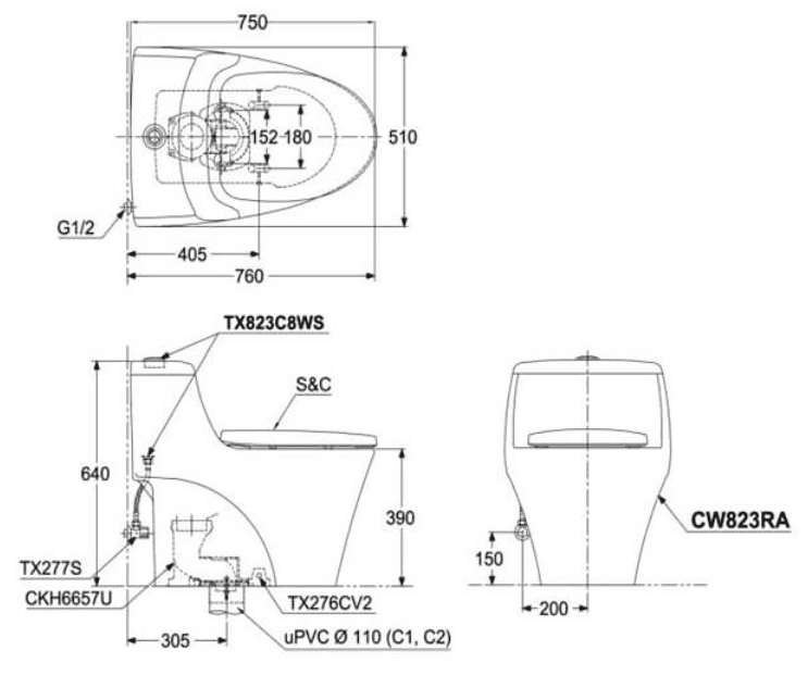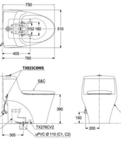 Để có thể dễ dàng hơn trong việc lắp đặt, quý khách tham khảo thêm bản vẽ kỹ thuật của bồn cầu TOTO CW823RAT2 nắp rửa cơ dưới đây nhé!