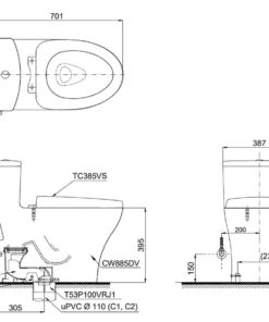Bản vẽ kích thước bồn cầu liền khối TOTO MS 885DT3 nắp TC385VS