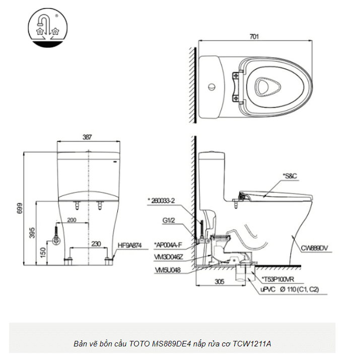 Bản vẽ hỗ trợ lắp đặt bồn cầu TOTO MS889DRE4
