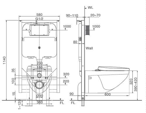 Bản vẽ của bồn cầu treo tường INAX AC-23P+CW-H17VN