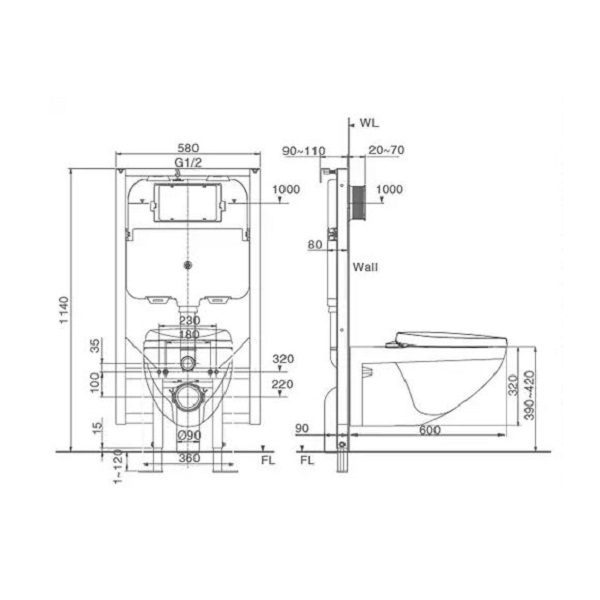 | Kích thước bồn cầu (DxRxC) | 600 x 365 x 320 mm |
