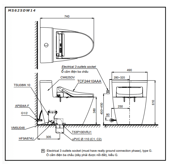 Bản vẽ Bồn Cầu WASHLET 1 Khối TOTO MS625DW14 kèm nắp điện tử WASHLET W14: TCF24410AAA