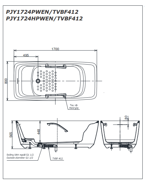 - Bao gồm có thanh tay vịn, bộ xả nhấn, ống thoát thải bồn tắm (TVBF412)