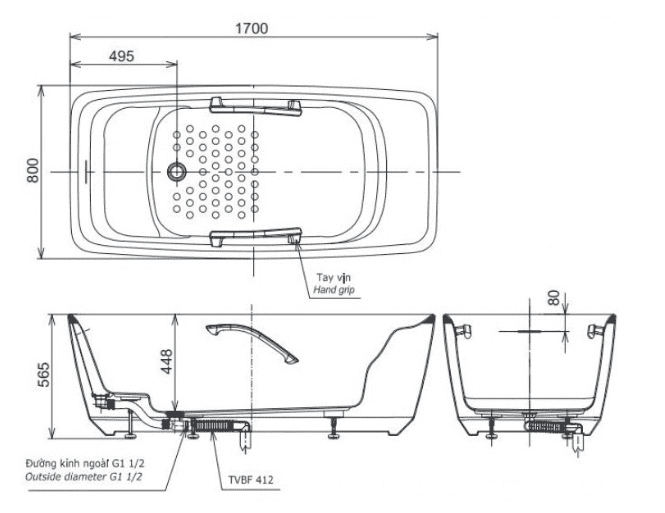 - Bao gồm bộ xả nhấn, ống thoát thải bồn tắm (TVBF412)