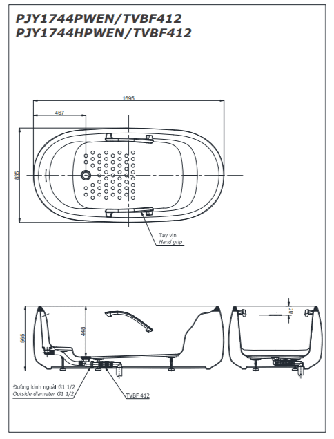 - Bao gồm bộ xả nhấn, ống thoát thải bồn tắm (TVBF412) không bao gồm tay vịn