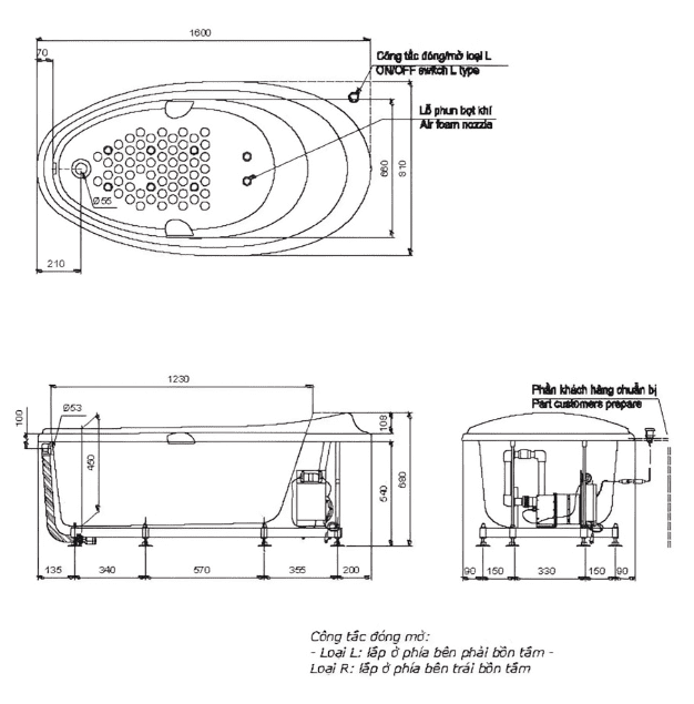 - Bồn tắm được trang bị công nghệ massage sục khí, phun các lớp bọt khí trong nước giúp giảm căng thẳng và tạo cảm giác thoải mái khi tắm.