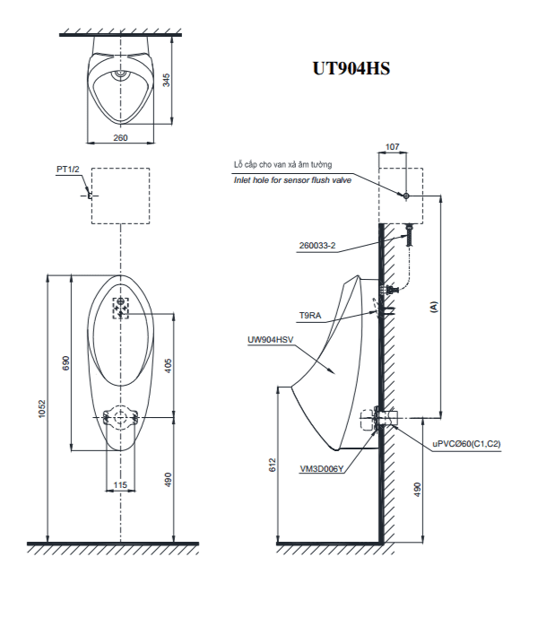 Bản vẽ Bồn Tiểu Nam TOTO UT904HN#XW Treo Tường
