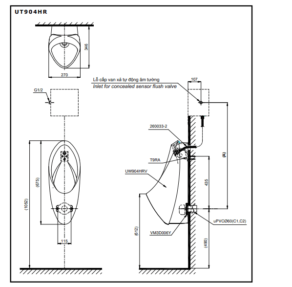 Bản vẽ Bồn Tiểu Nam TOTO UT904HR#W Treo Tường