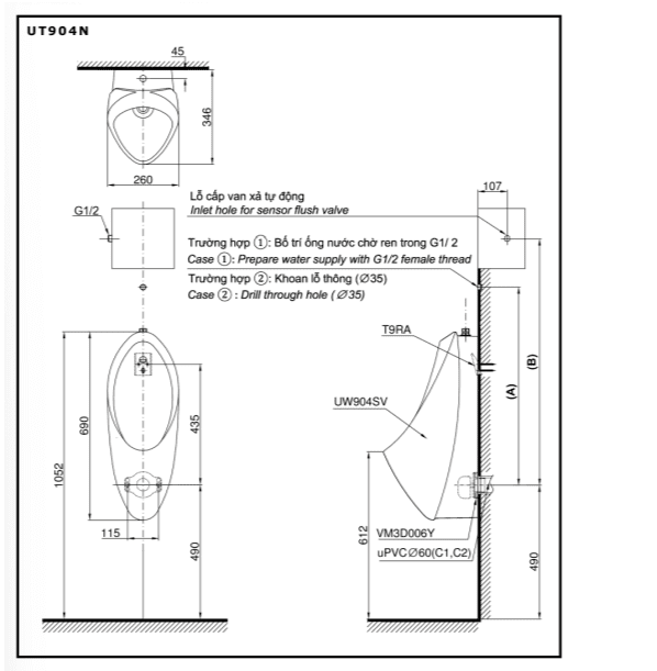 Bản vẽ Bồn Tiểu Nam TOTO UT904N#W Treo Tường