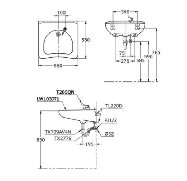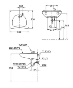 Bản vẽ Chậu Rửa Mặt Lavabo Dành Cho Người Khuyết Tật TOTO LW103JT1#W