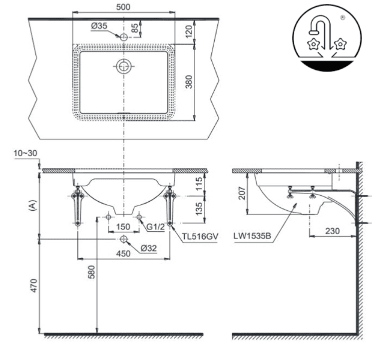 Để dễ dàng thuận tiện hơn trong việc lắp đặt, các bạn có thể tham khảo bản vẽ kỹ thuật của lavabo âm bàn TOTO LW1535V dưới đây nhé!