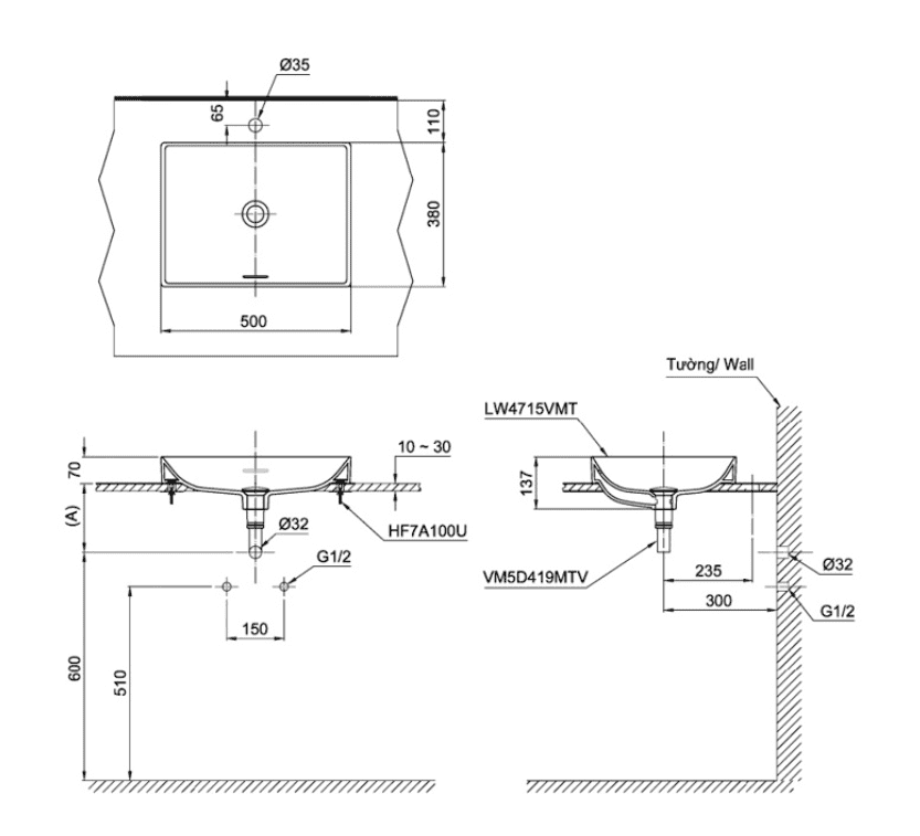 - Kích thước lỗ bắt vòi: Ø35 (mm)