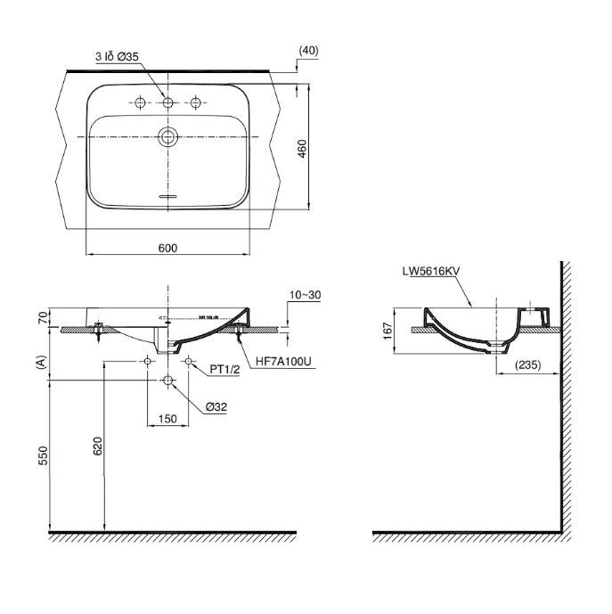 Bản vẽ Chậu Rửa Mặt TOTO LT5616#XW Đặt Bàn 3 Lỗ