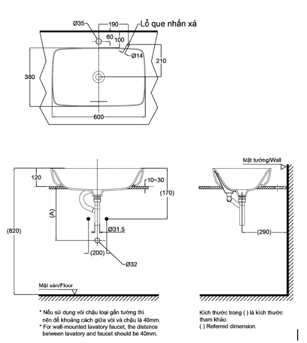 - Kích thước lỗ bắt vòi: Ø35 (mm)