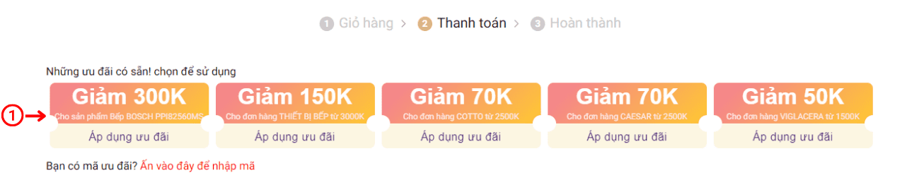 Đầu tiên, Quý khách có thể lựa chọn mã ưu đãi đang có sẵn website. Quý khách lưu ý đọc kỹ điều kiện áp dụng để được ưu đãi.