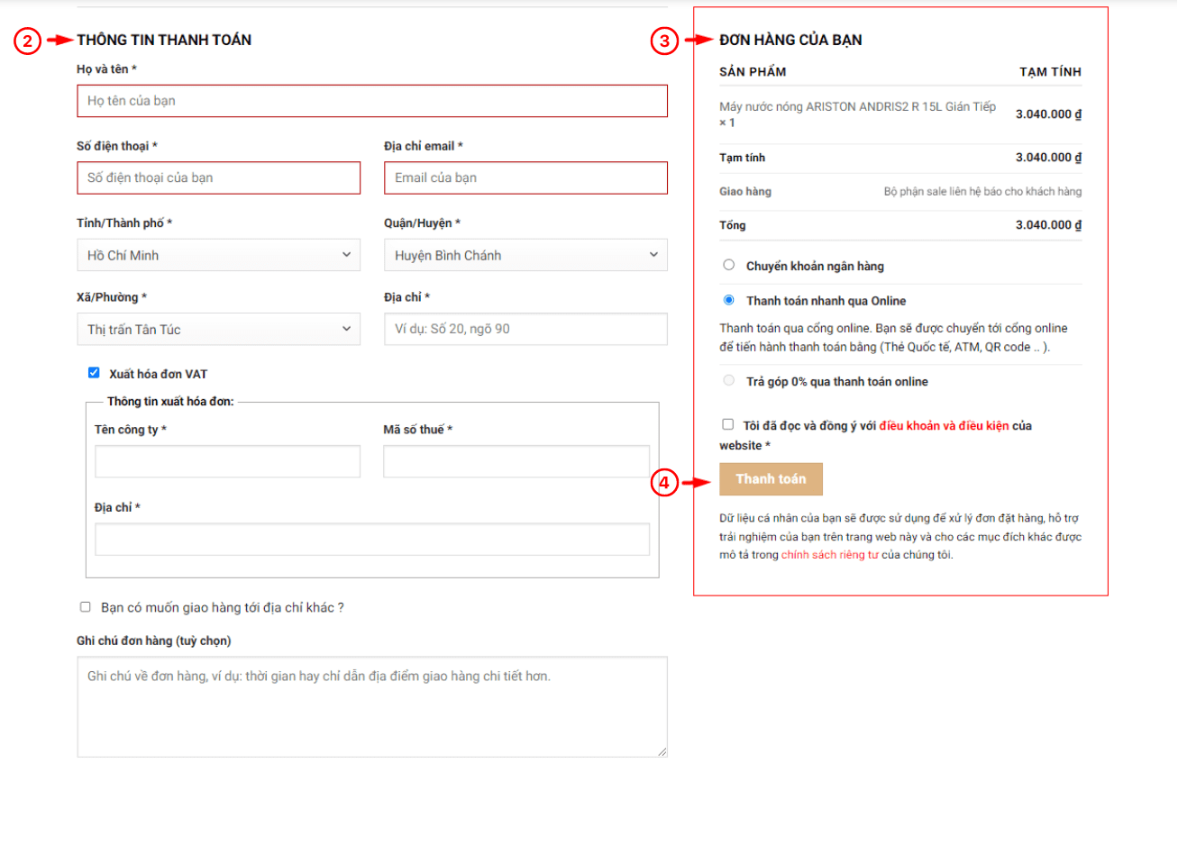 Nếu cần xuất hóa đơn VAT, bạn vui lòng điền đầy đủ thông tin vào mục “Xuất hóa đơn VAT”, bao gồm: “Tên công ty”, “Mã số thuế” và “Địa chỉ”.