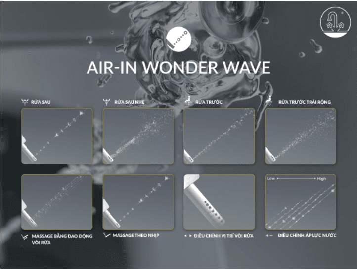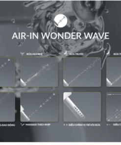 Vòi rửa massage đa chức năng, rửa sạch, êm ái. Và tự vệ sinh vòi rửa trước và sau khi sử dụng. Phải kể đến công nghệ Air-in-wonder giúp bơm không khí vào từng giọt nước, vừa nhẹ nhàng và thư thái. Bổ sung thêm các tùy chỉnh khác như Cách xịt rửa (lên xuống), cường độ xịt (mạnh yếu) hay đơn giản là nhiệt độ nước