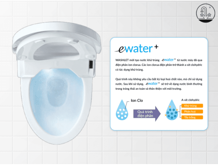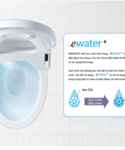 Công nghệ nước điện phân khử khuẩn Ewater+ (Phun tráng lòng bàn cầu và vệ sinh vòi rửa) giúp bảo vệ người dùng và đảm bảo yếu tố vệ sinh sạch sẽ.