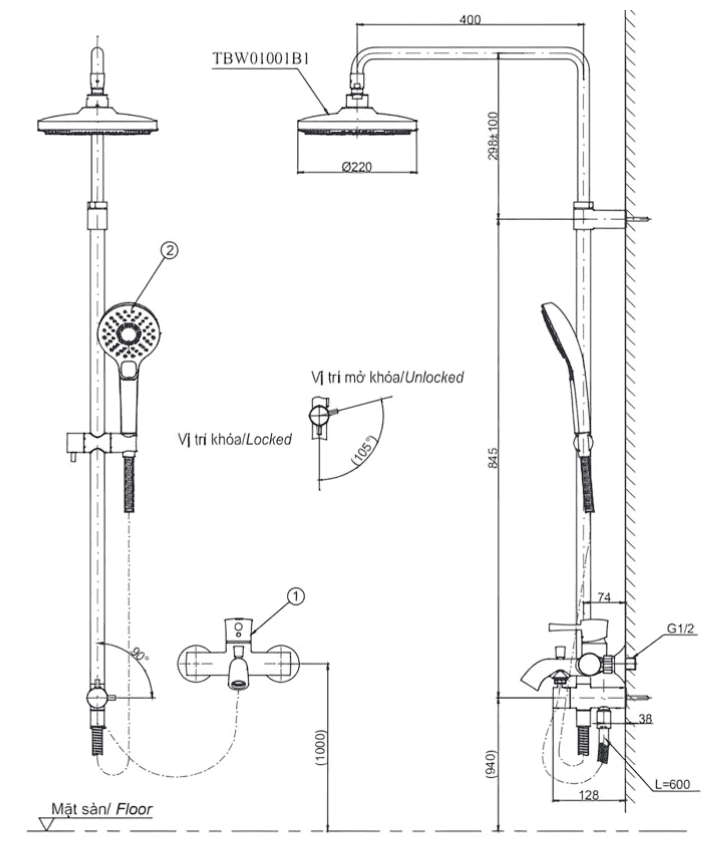• Áp lực nước: 0.05MPa ~ 0.75MPa