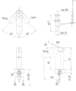 Vòi chậu này đã bao gồm một trụ xả ty làm bằng đồng mạ crom. Chiều cao của trụ xả ti 201mm. Là mẫu vòi chậu có chiều cao trung bình nên kích thước từ lỗ vòi đến đáy vào khoảng 85mm. chiều cao từ đỉnh đến đáy là 151mm