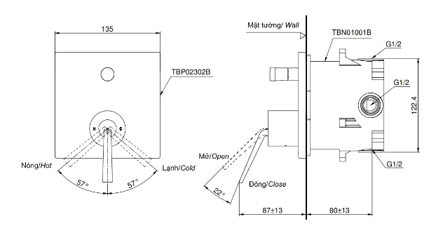 • Áp lực nước: 0.05MPa ~ 0.75MPa