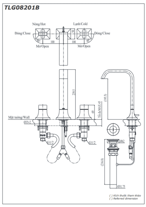 Bản vẽ Vòi Lavabo TOTO TLG08201B Tay Vặn Nóng Lạnh GC (3 Lỗ)